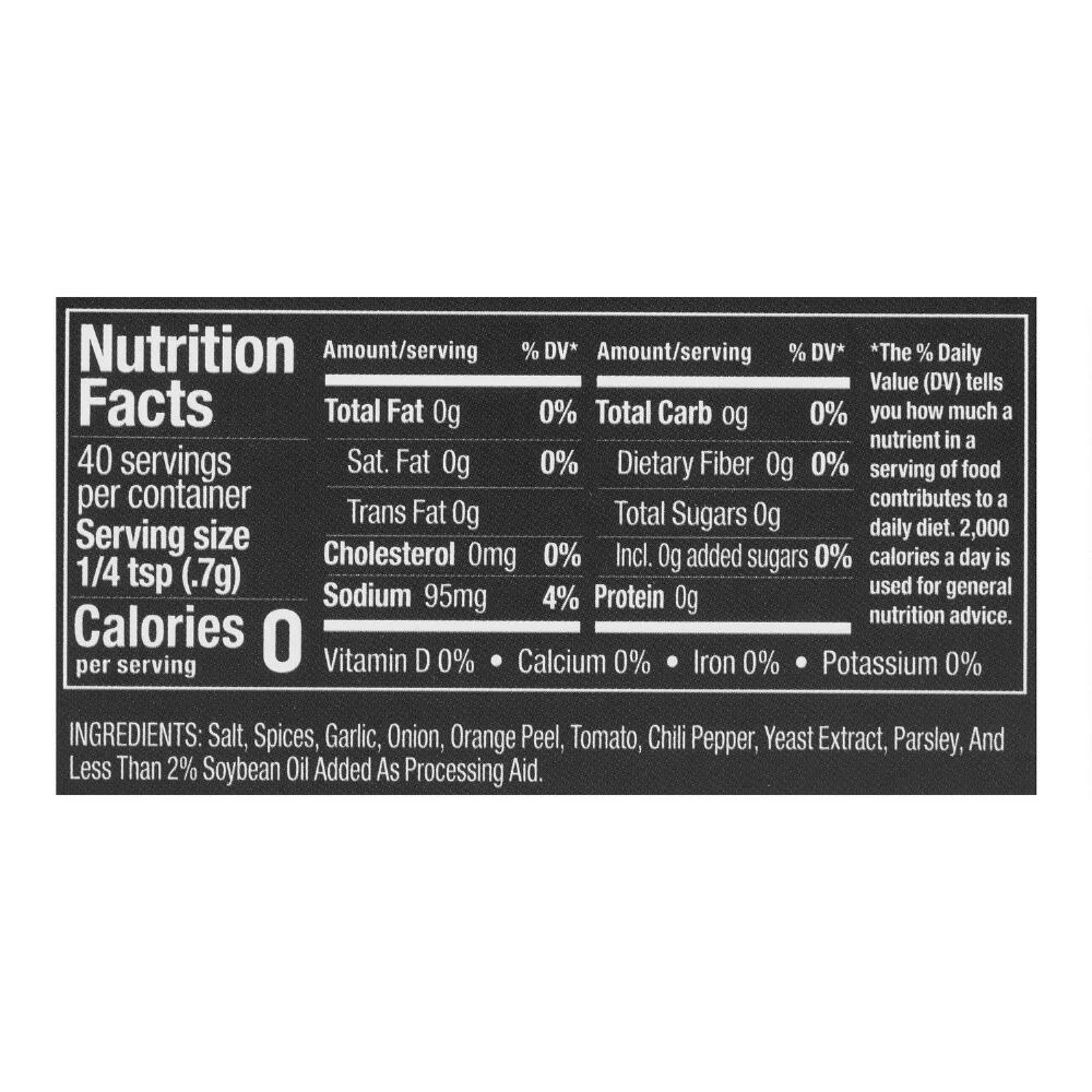 - Made with salt, spices, garlic, onion, orange peel, tomato, chili pepper and parsley