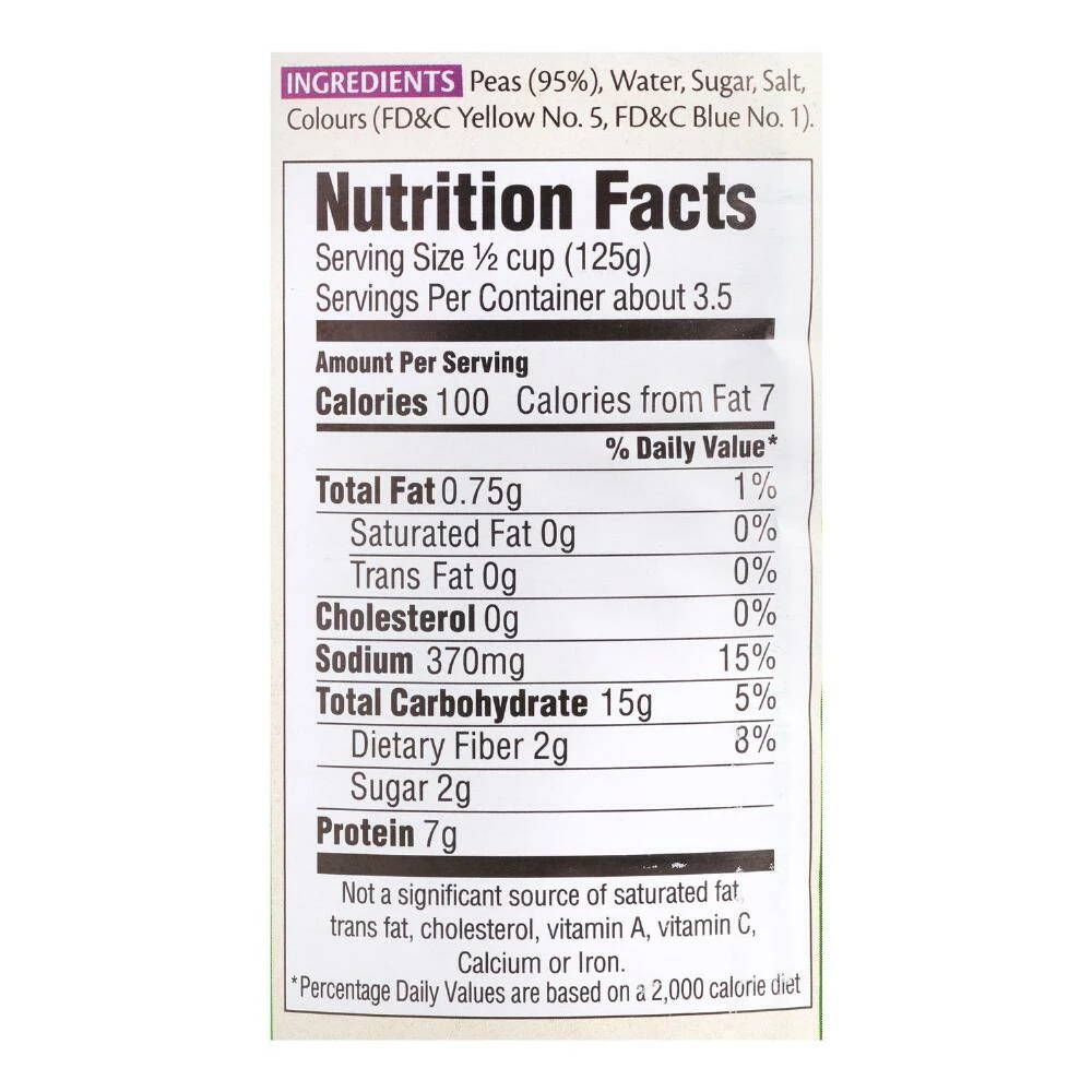 - Made with peas, water, sugar and salt