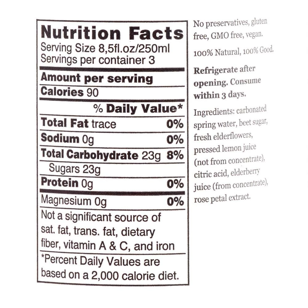 - Made with carbonated water, pressed lemon juice, elderberry juice and rose petal extract