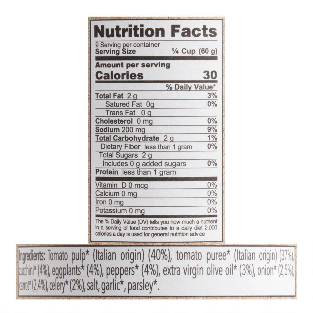 - Made with tomatoes, zucchini, eggplants, bell peppers, extra-virgin olive oil and garlic