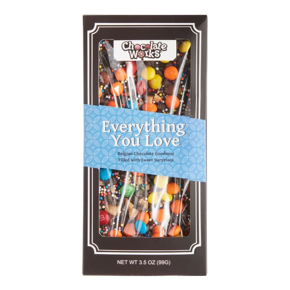 Nostalgic candies like M&M’s, peanut butter chips and colorful nonpareils top this rich dark chocolate bar for a treat that’s sure to delight any sweets lover. Handmade by chocolatiers with gourmet Belgium chocolate, it’s a decadent dessert choice that makes any celebration sweeter.