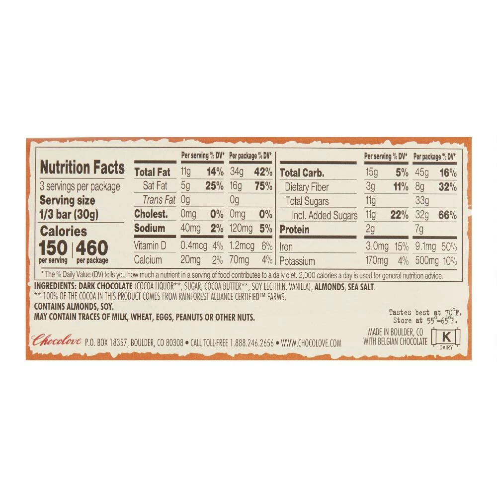 - Made of 55% dark chocolate, roasted almonds and sea salt