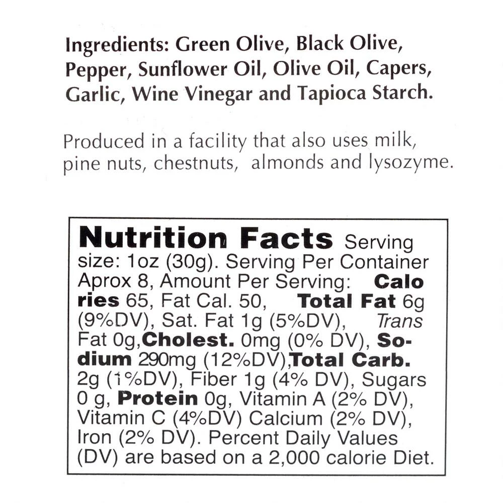 - Made with green olives, black olives, pepper, olive oil, capers, garlic and wine vinegar