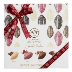 Premium confections are the reason for the season with this delicious assortment of cream-filled chocolates in the shape of cocoa-bean pods. This scrumptious selection includes dark chocolate with cocoa cream, milk chocolate with hazelnut, white chocolate with espresso cream and genuine ruby chocolate. Ornamental chocolates festoon the box and it’s tied up with a bright red bow, making this a perfect gift for chocolate lovers and holiday hosts.