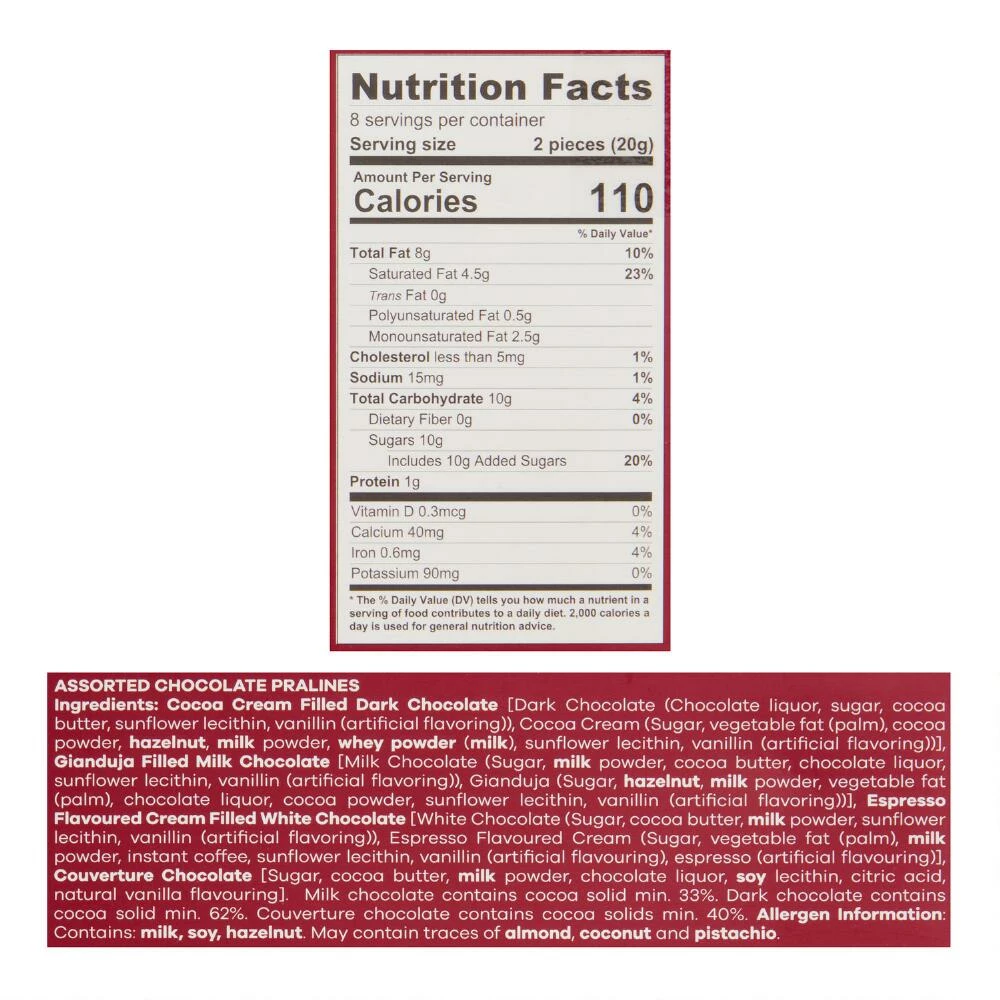 - 16-Piece includes Dark Chocolate with Cocoa Cream, Milk Chocolate with Hazelnut, White Chocolate with Espresso Cream and Ruby Chocolate pralines