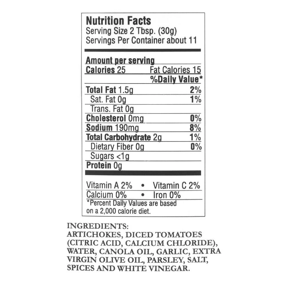 - Made of artichoke, diced tomatoes, water, canola oil, garlic, extra-virgin olive oil, parsley, salt, spices and white vinegar