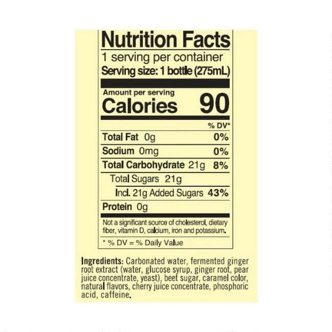 - Made with carbonated water, fermented ginger root extract, sugar and cherry juice