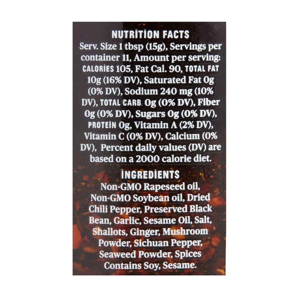 - Made with dried chili peppers, fermented black beans, garlic, sesame oil, shallots, ginger and Sichuan pepper