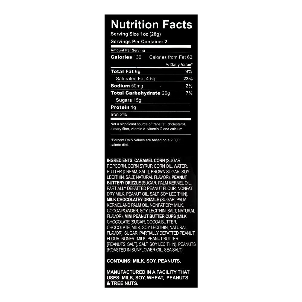 Sweet caramel popcorn is hand-drizzled with caramel and white, milk and dark chocolates and then topped with a dash of crunchy peanut pieces and peanut butter cups to create this delicious gourmet treat. A great addition to gift baskets, this delectable munch is made in small batches with an artisan touch.
