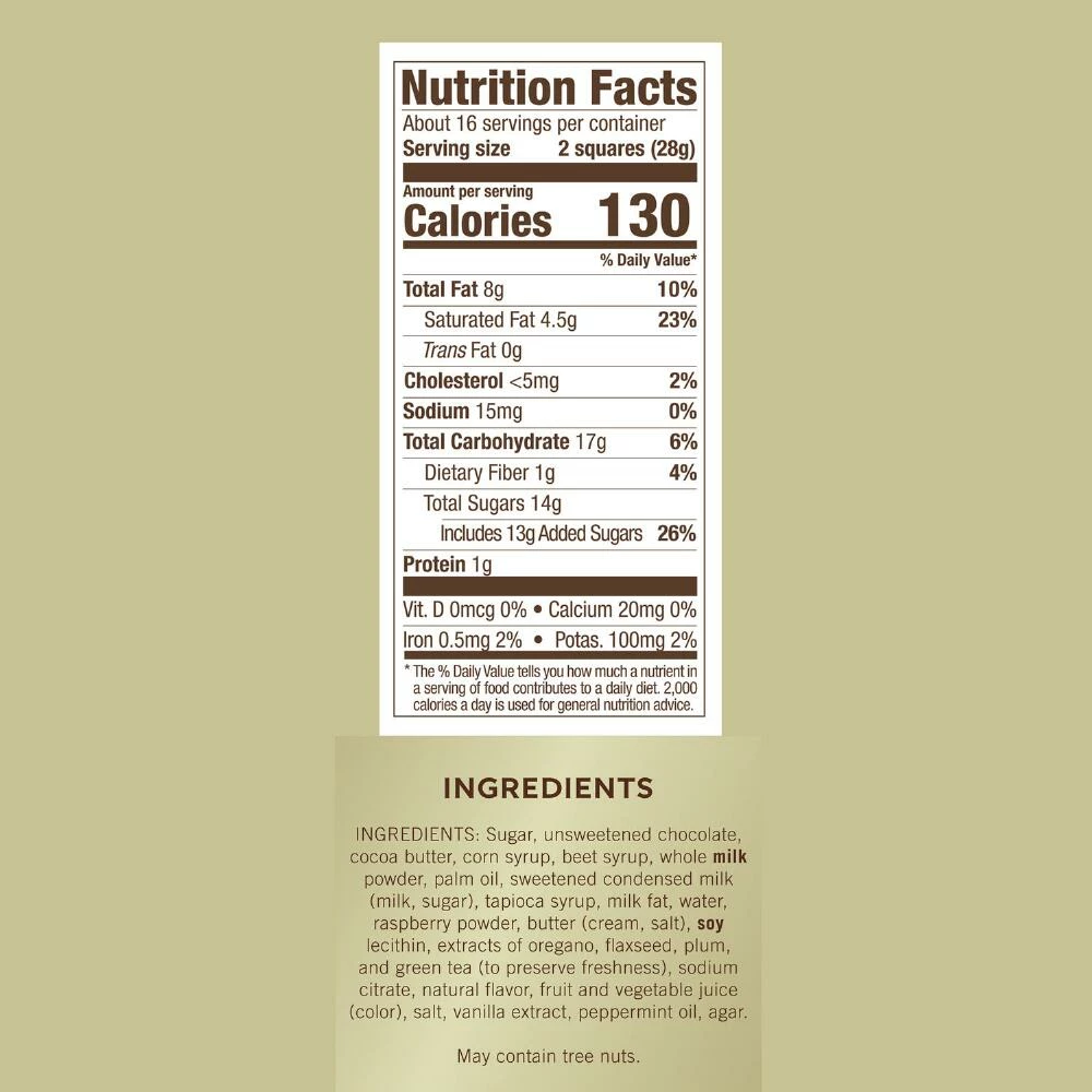 - Made with dark and milk chocolate, caramel, peppermint oil and raspberries