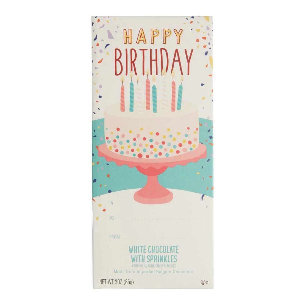 A delicious way to send birthday wishes to someone special, this festive bar is made of creamy white chocolate and sprinkles. Sweet with a slight crunch, its designed with a colorful birthday cake and message for the perfect gift.