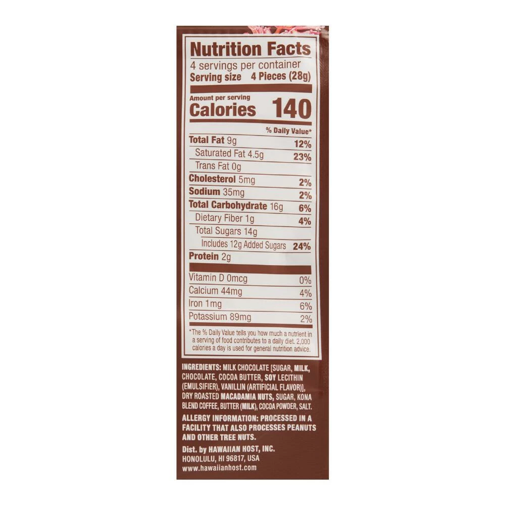 Clusters of coffee-glazed macadamia nuts are enrobed in rich milk chocolate and finished with cocoa powder to create this signature Hawaiian treat. From its humble beginnings in Honolulu over 80 years ago, Hawaiian Host specializes in creative combinations of premium chocolate and buttery macadamia nuts.