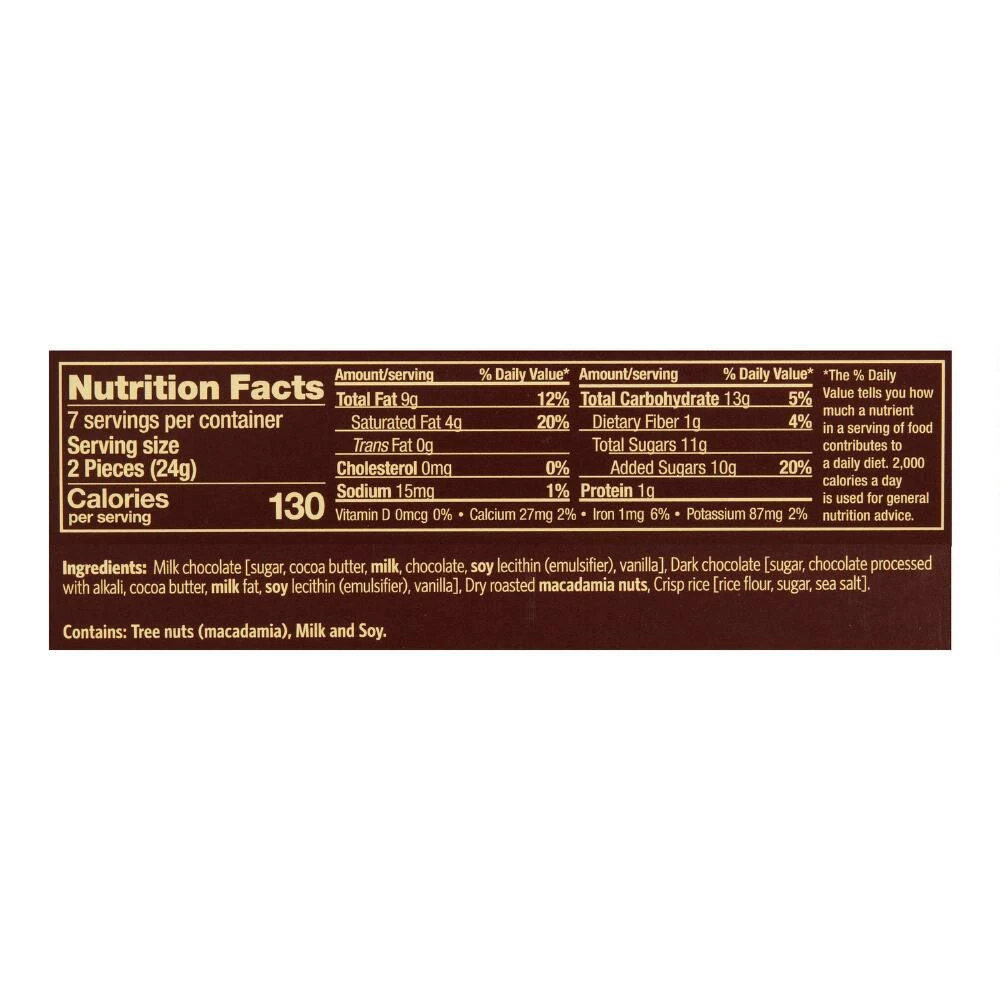 - Made with milk and dark chocolates, macadamia nuts and rice crisps