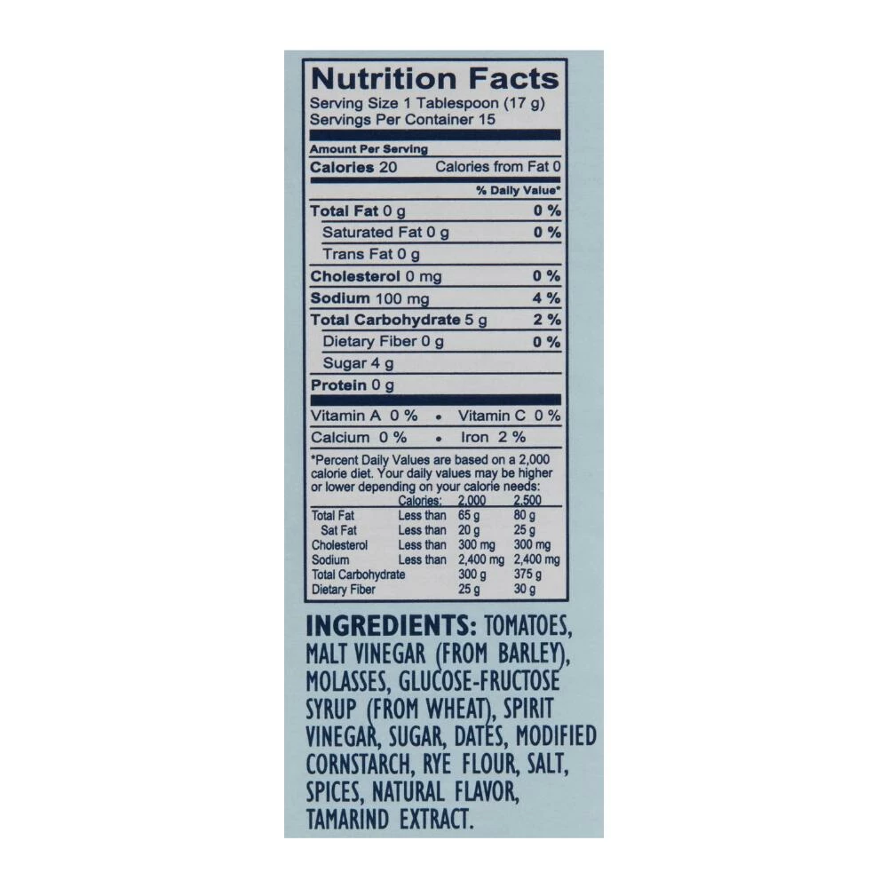 - Made with malt vinegar, tomatoes, dates, tamarind extract, and spices