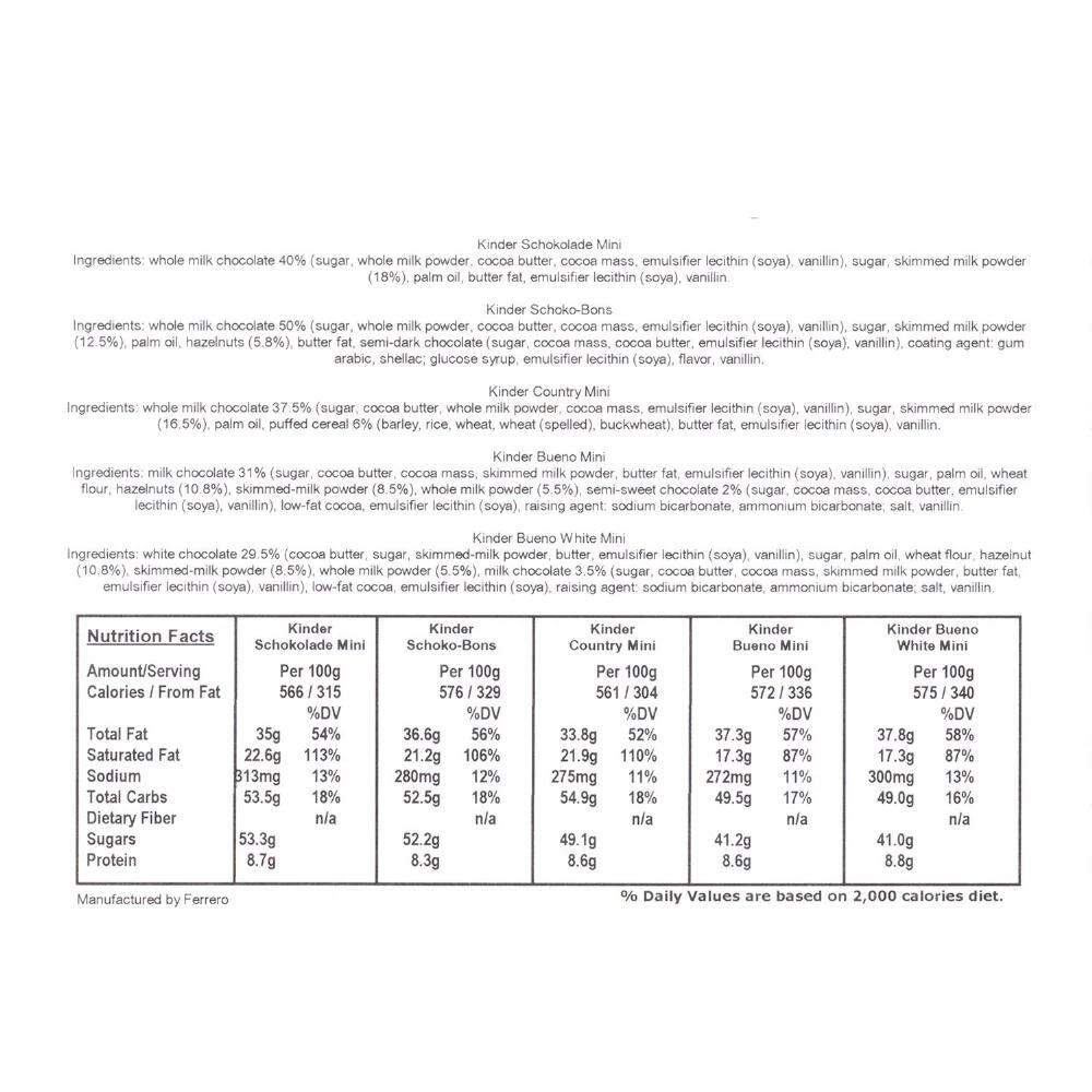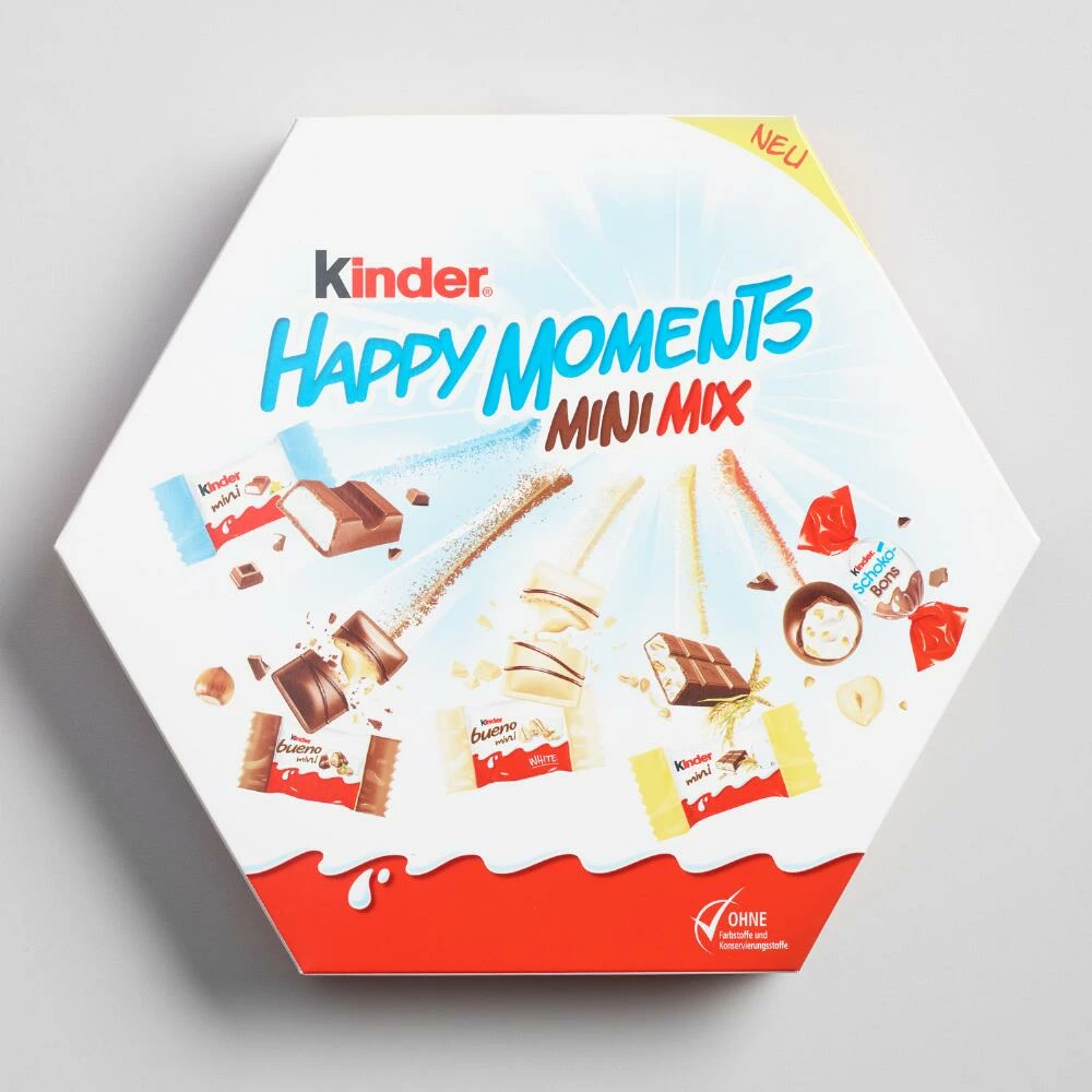 A mouthwatering mix of Kinder chocolates, these bite-sized minis are ideal for sharing or filling candy jars. This tasty collection of German favorites has something for everyone with Kinder Choco Bons, Kinder Country bars, Kinder Chocolates, Kinder Buenos and Kinder Bueno White chocolates.