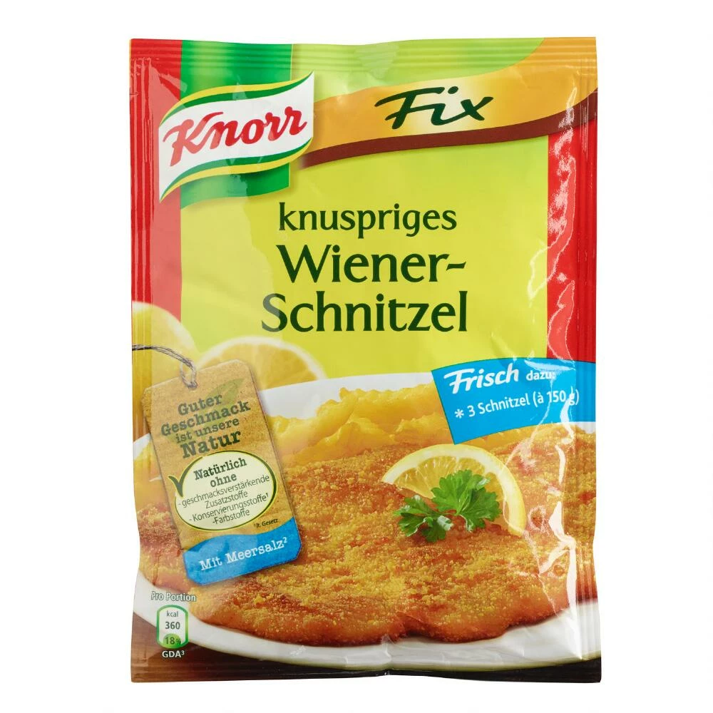 The perfect blend of spices, Knorr Knuspriges Weiner Schnitzel helps you make perfect weiner schnitzel every time. One package will coat 2 to 3 pieces of pork, veal or chicken.