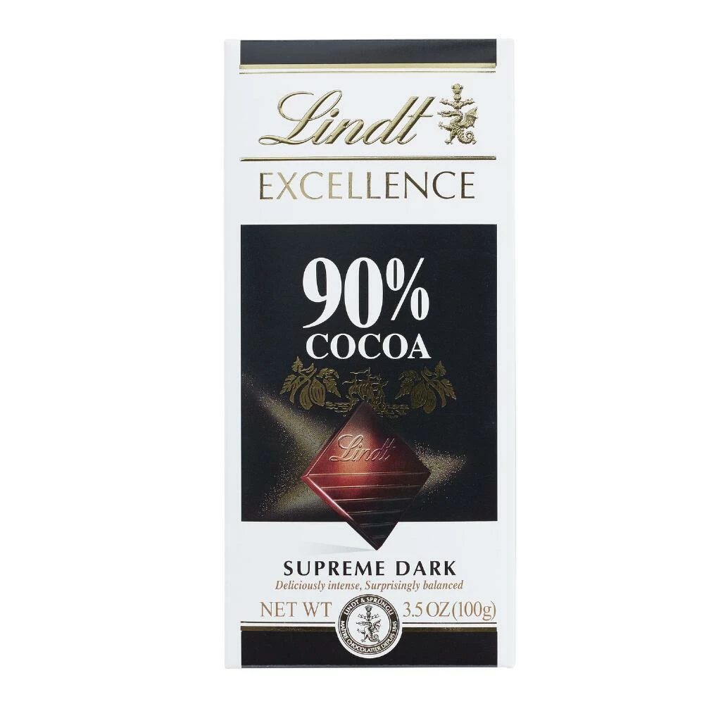 A full-bodied experience for sophisticated dark chocolate connoisseurs, this Lindt Excellence 90% cocoa bar is smooth, rich and perfectly balanced. Give in to the complex flavor profile of this Swiss supreme-dark chocolate, a gourmet treat created by Lindt’s master chocolatiers.