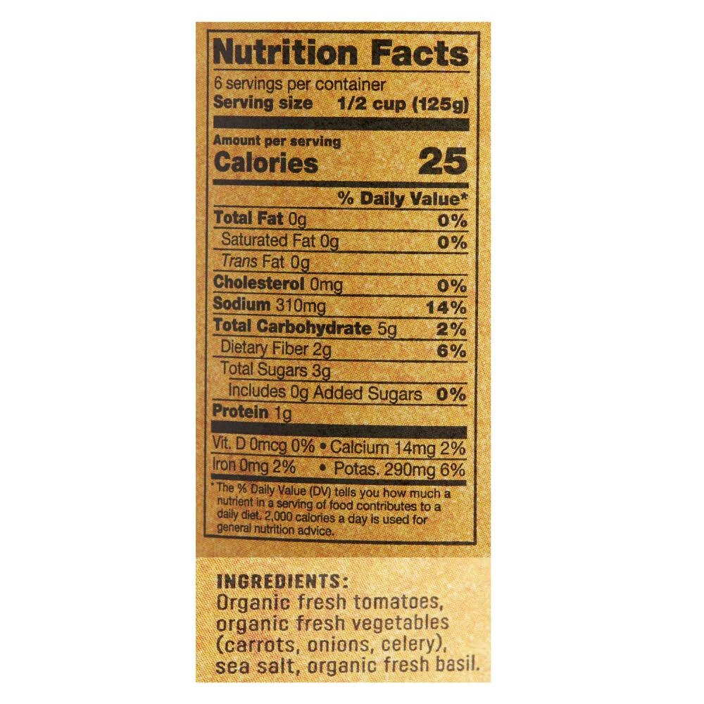 - Made of fresh tomatoes, carrots, onions, celery, sea salt and basil