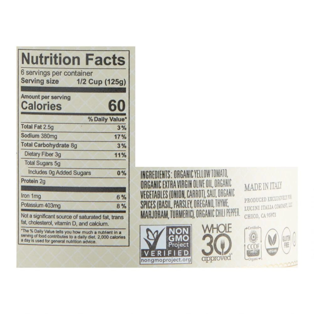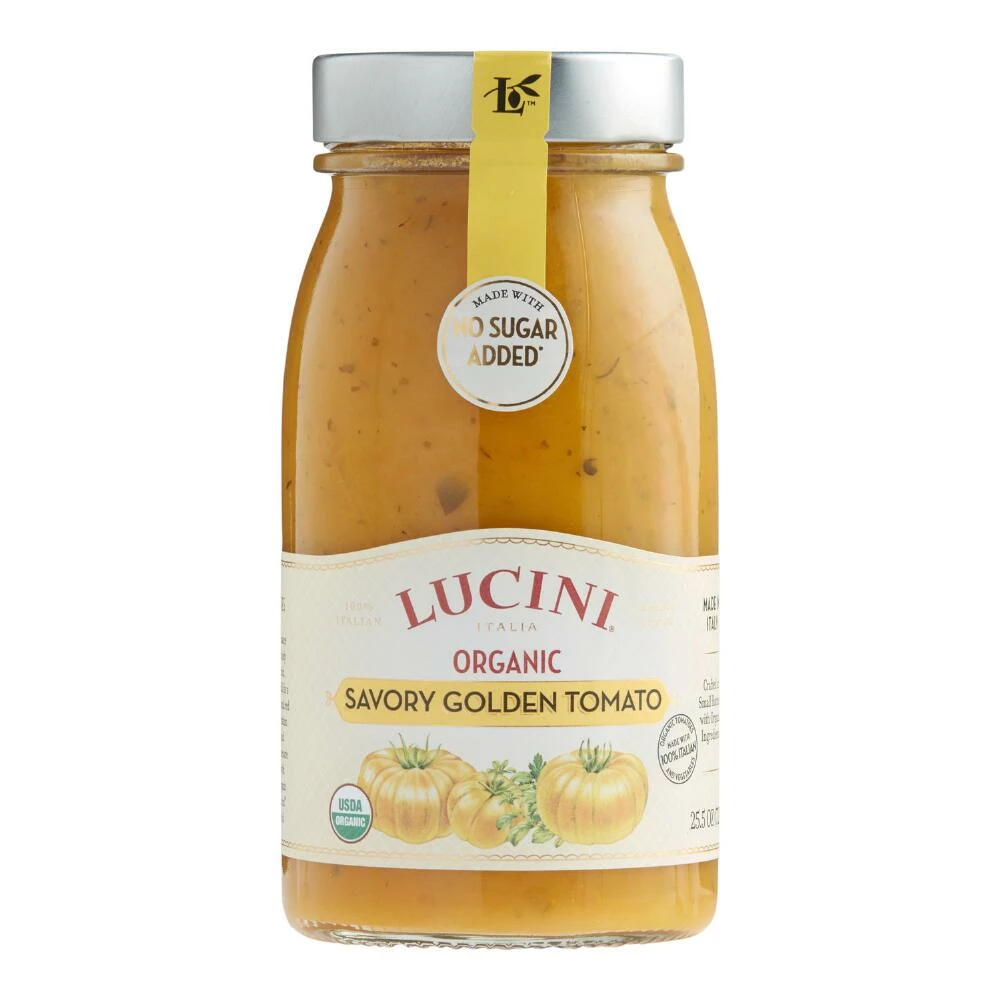 Crafted in Italy, this 100% organic pasta sauce is made with the finest quality yellow tomatoes, fresh herbs and extra-virgin olive oil. A uniquely savory golden marinara sauce for pastas and pizzas, it also makes a delicious base for tomato soups. Lucini’s garden-fresh vegetables are picked at the peak of harvest and taken from field to jar in just 24 hours.
