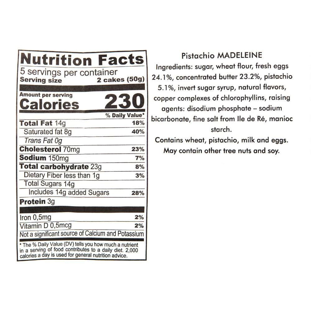 A decadent delight paired with tea or a frothy café au lait, these delicate, shell-shaped sponge cakes are infused with rich pistachio nuts. Authentically made in France with a sweet taste and soft texture, these gourmet Parisian pastries are also delicious served with ice cream.
