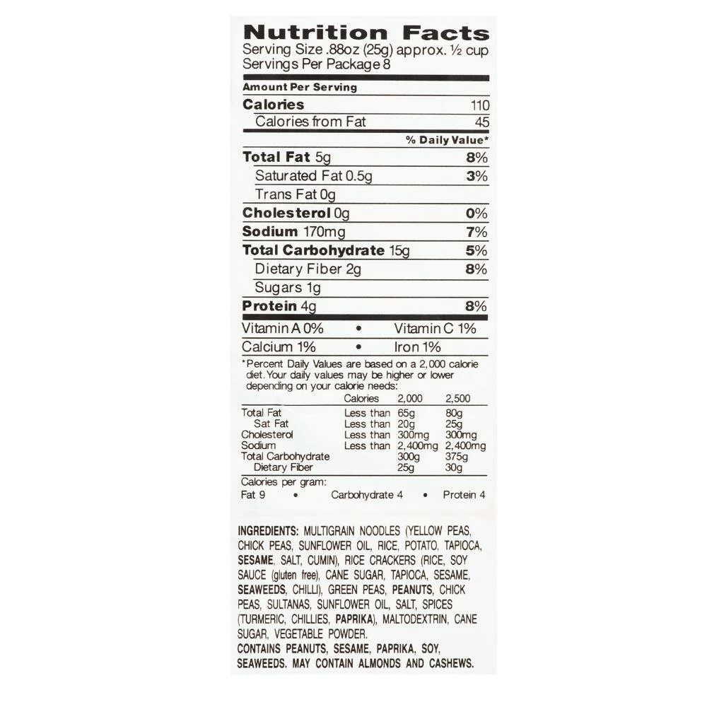 - Made with rice crackers, multigrain noodles, green peas, sultanas, chickpeas, peanuts and spices