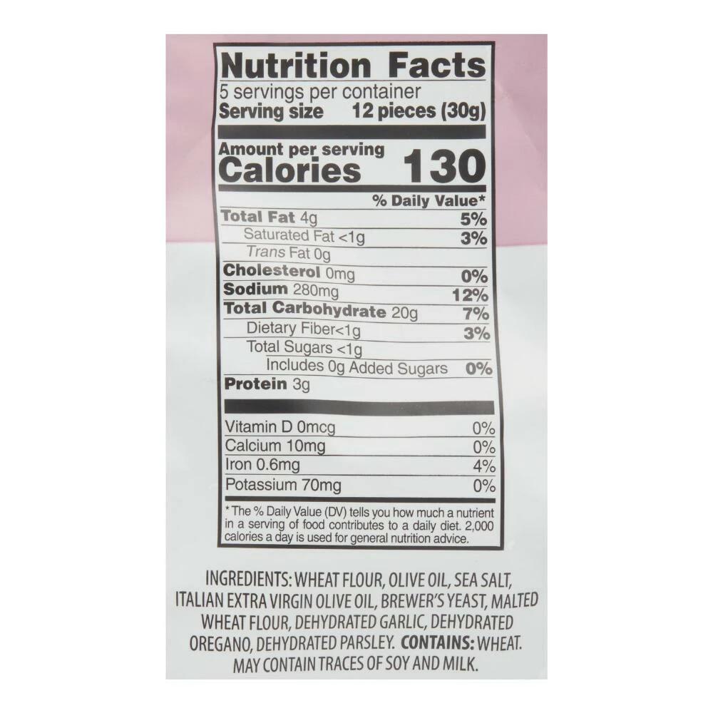 - Made of wheat flour, olive oil, sea salt, garlic and herbs