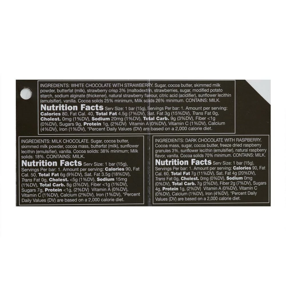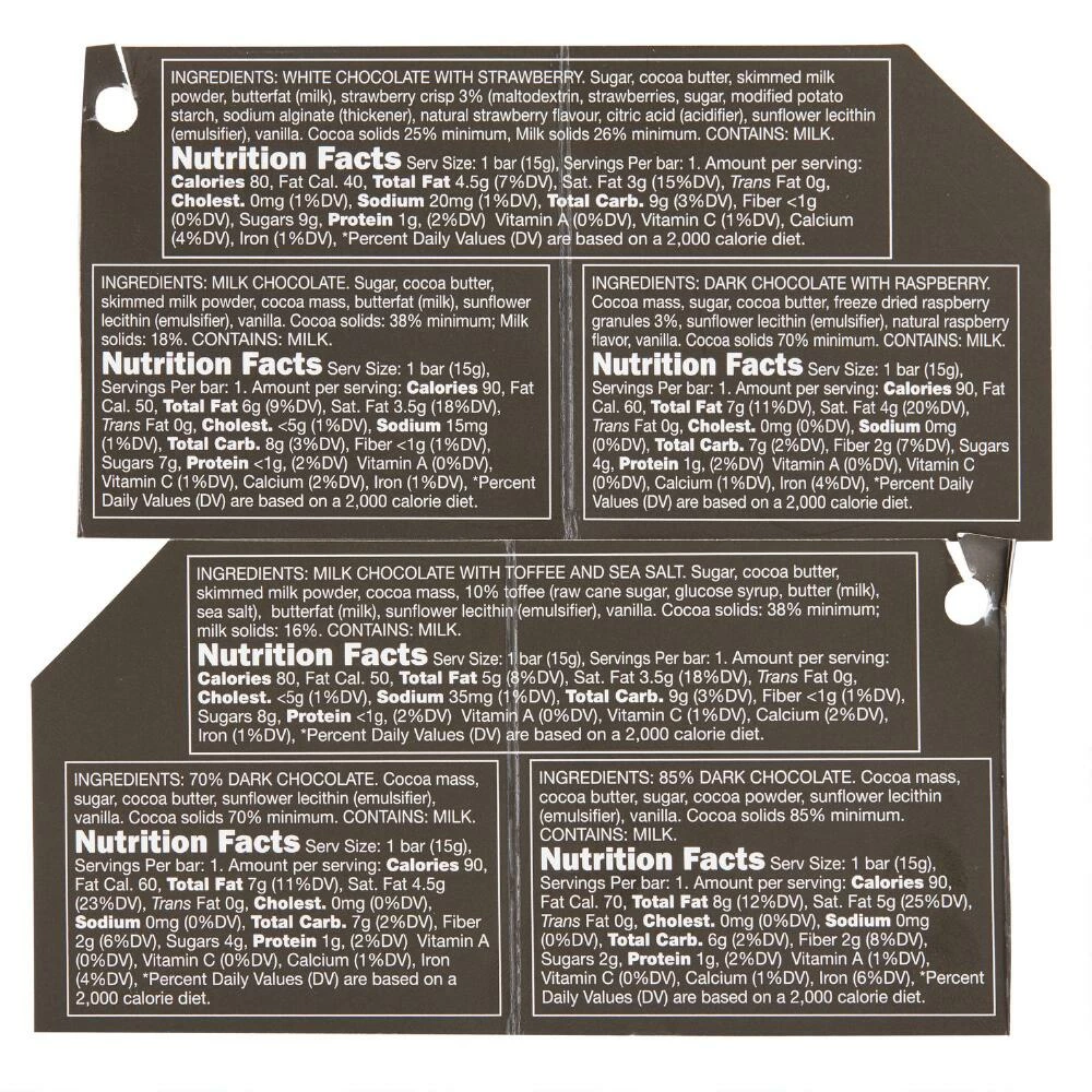 - 6-Pack includes 70% dark chocolate, 85% dark chocolate, dark chocolate with raspberry, milk chocolate with toffee and sea salt, milk chocolate and white chocolate with strawberry flavors