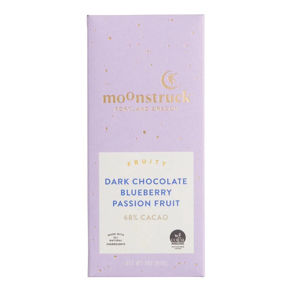 A luxurious combination of blueberry and passionfruit, this 68% dark chocolate bar is a one-of-a-kind sweet and slightly tangy sensation. Featuring Portland artists’ original artwork on the inside of each wrapper, Moonstruck Chocolate uses fresh ingredients from trusted sources to craft their exquisite collection of chocolate bars.