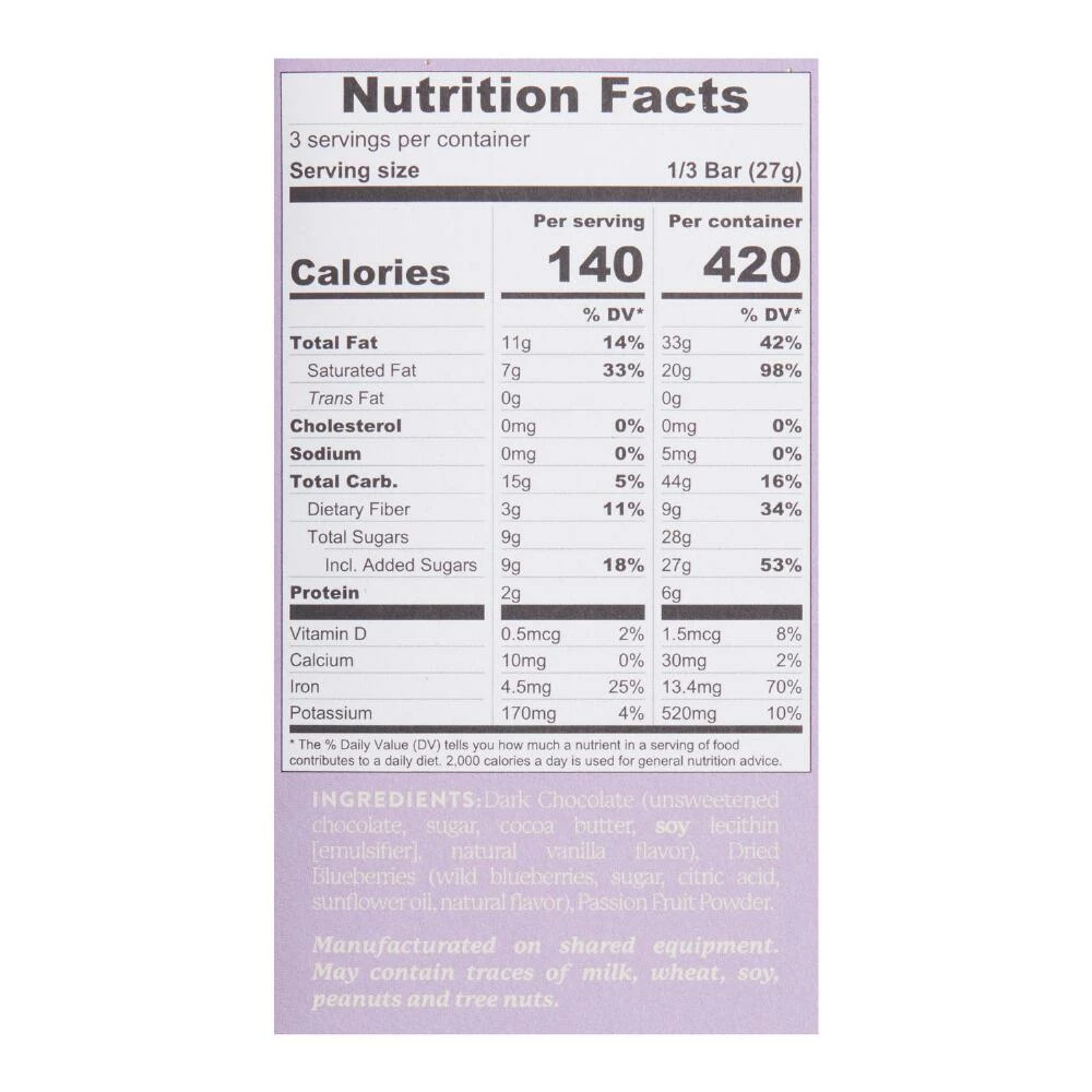 - Made of 68% dark chocolate, dried blueberries and passionfruit powder