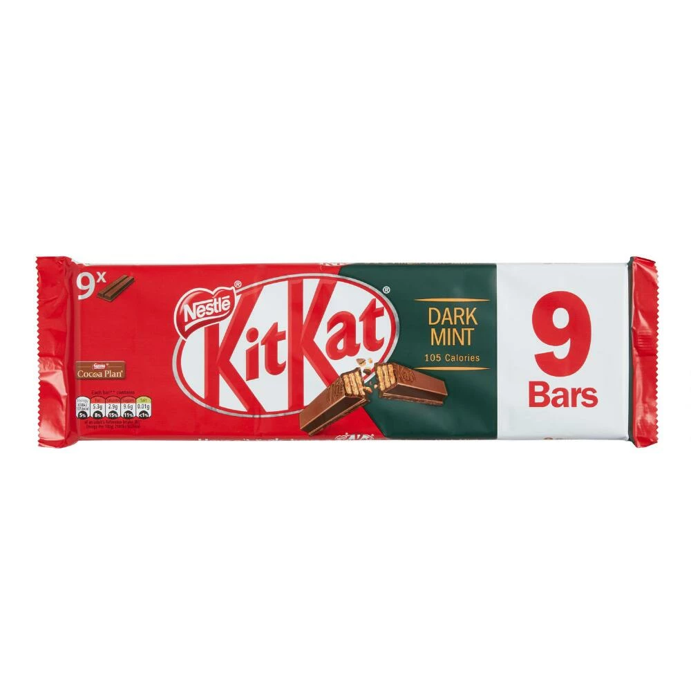 Crisp cookie wafers are smothered in smooth minty dark chocolate for a delicious twist on a British tea-break favorite. Perfect with your favorite hot beverage for a mid-afternoon treat, this pack contains nine individually-wrapped bars with two fingers in each.
