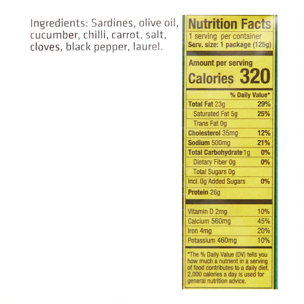 - Wild-caught Portuguese sardines in extra virgin olive oil with piri-piri, cloves, carrots, cucumbers and black pepper
