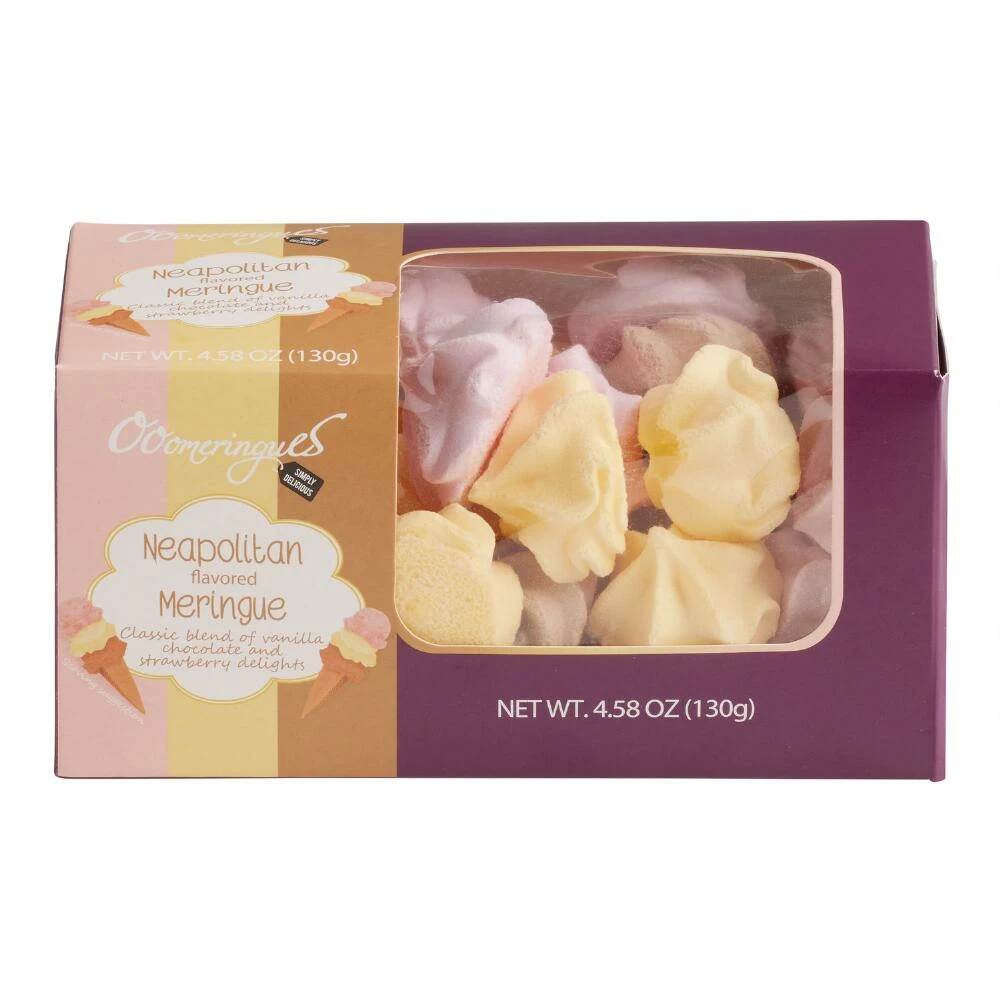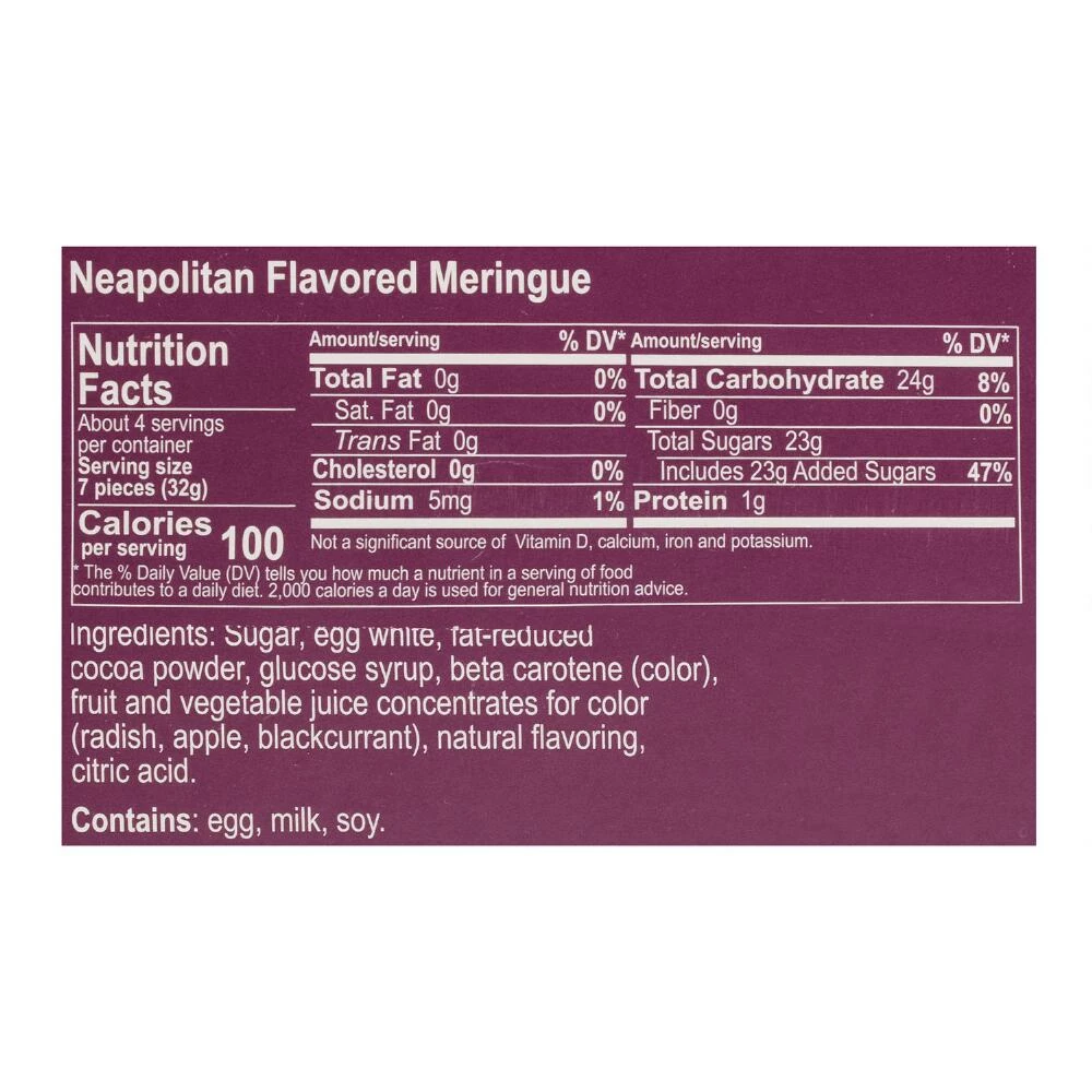Made with whipped egg whites, these meringue cookies in the Neapolitan flavors of vanilla, chocolate and strawberry are handcrafted in the Netherlands using an original, milk-free recipe. A perfect fat-free dessert with an airy texture, these light and delicate meringue biscuits are a great way to satisfy your sweet tooth any time of day.