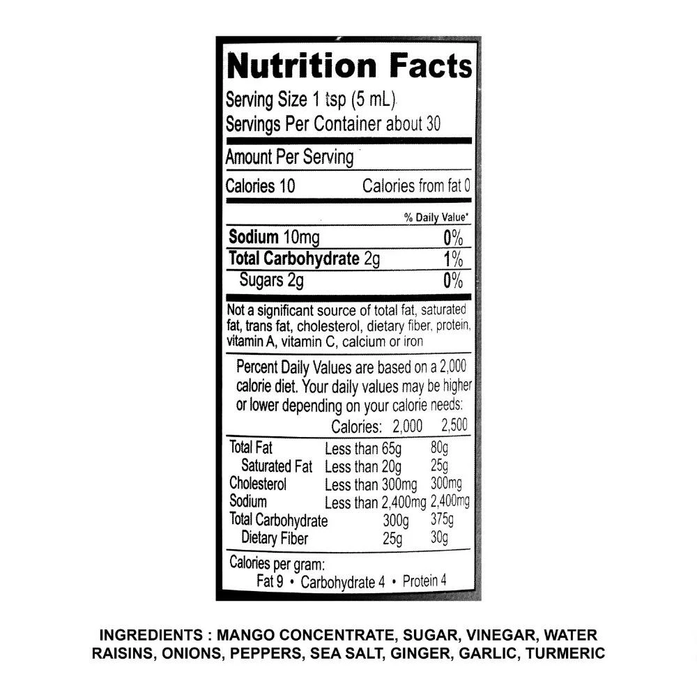 - Made with mangoes, cane sugar, ginger, peppers, raisins, onions and garlic