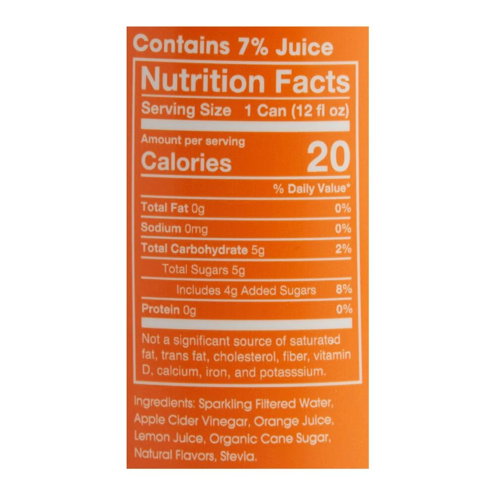 - Made with filtered sparkling water, apple cider vinegar, orange juice, lemon juice and organic cane sugar