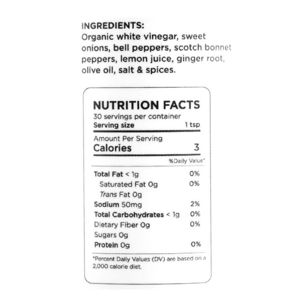 - Made with white vinegar, ginger, sweet onions, orange bell peppers, lemon, scotch bonnet hot peppers and spices