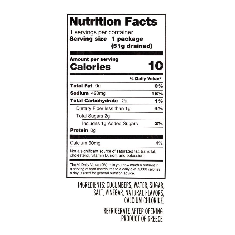 - Made with cucumbers, water, vinegar, natural flavors, sugar and salt