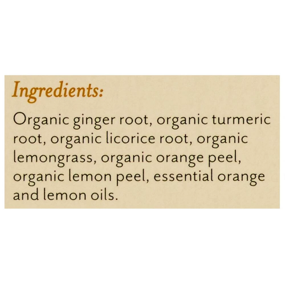 - Made with organic ginger root, organic turmeric root, organic licorice root, and organic lemongrass