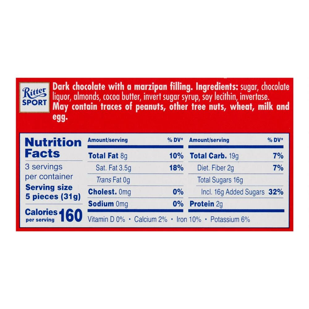 Crafted with fresh California almonds, marzipan is covered in rich dark chocolate and formed into mini squares, offering a delicious treat you can easily enjoy on the go. Since 1912, German confectioner Ritter Sport has been sustainably sourcing high-quality ingredients to craft the finest chocolates.