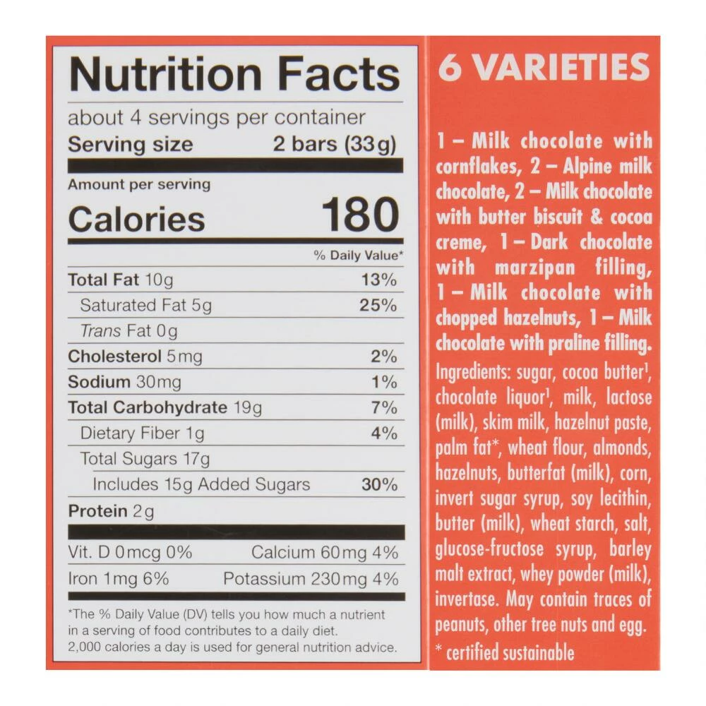 - 8-Pack includes Milk Chocolate Cornflake, Alpine Milk Chocolate, Milk Chocolate Butter Biscuit, Dark Chocolate Marzipan, Milk Chocolate Hazelnut and Milk Chocolate Praline flavors