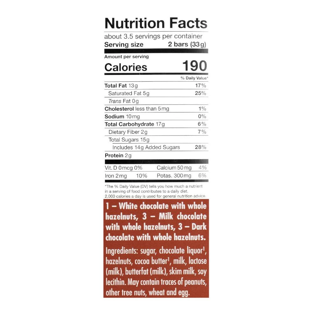 - Made with dark chocolate, milk chocolate, white chocolate and hazelnuts