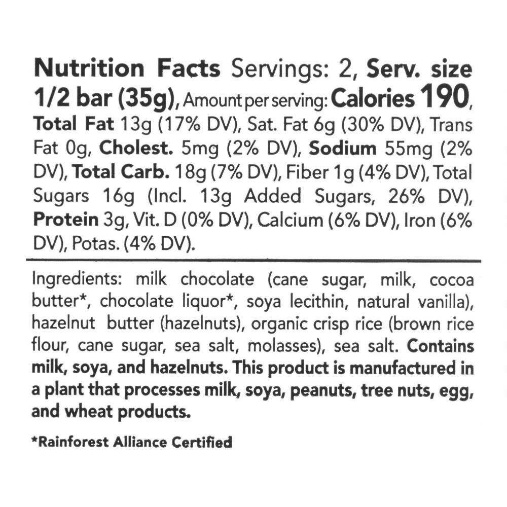 - Made with 32% milk chocolate, hazelnut butter and brown rice crisps