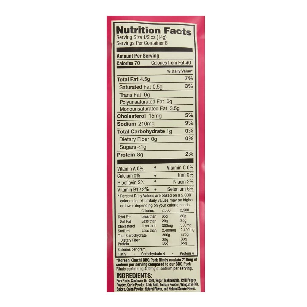 Smoky pork rinds are fried in sunflower oil in small batches and seasoned with a blend of garlic, vinegar, spicy peppers and natural smoke flavor for a Korean-inspired nosh. Great for fueling up on road trips, this savory bite is a tasty, protein-rich anytime snack.