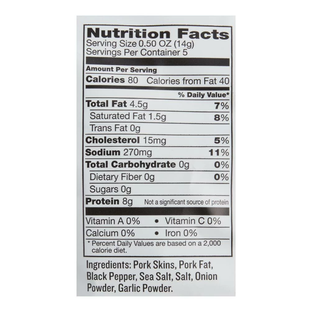 Smoky pork rinds are cooked in small batches and simply seasoned with sea salt and black pepper for a satisfying, crispy nosh. Great for fueling up on road trips, this savory bite is a tasty, protein-rich anytime snack.