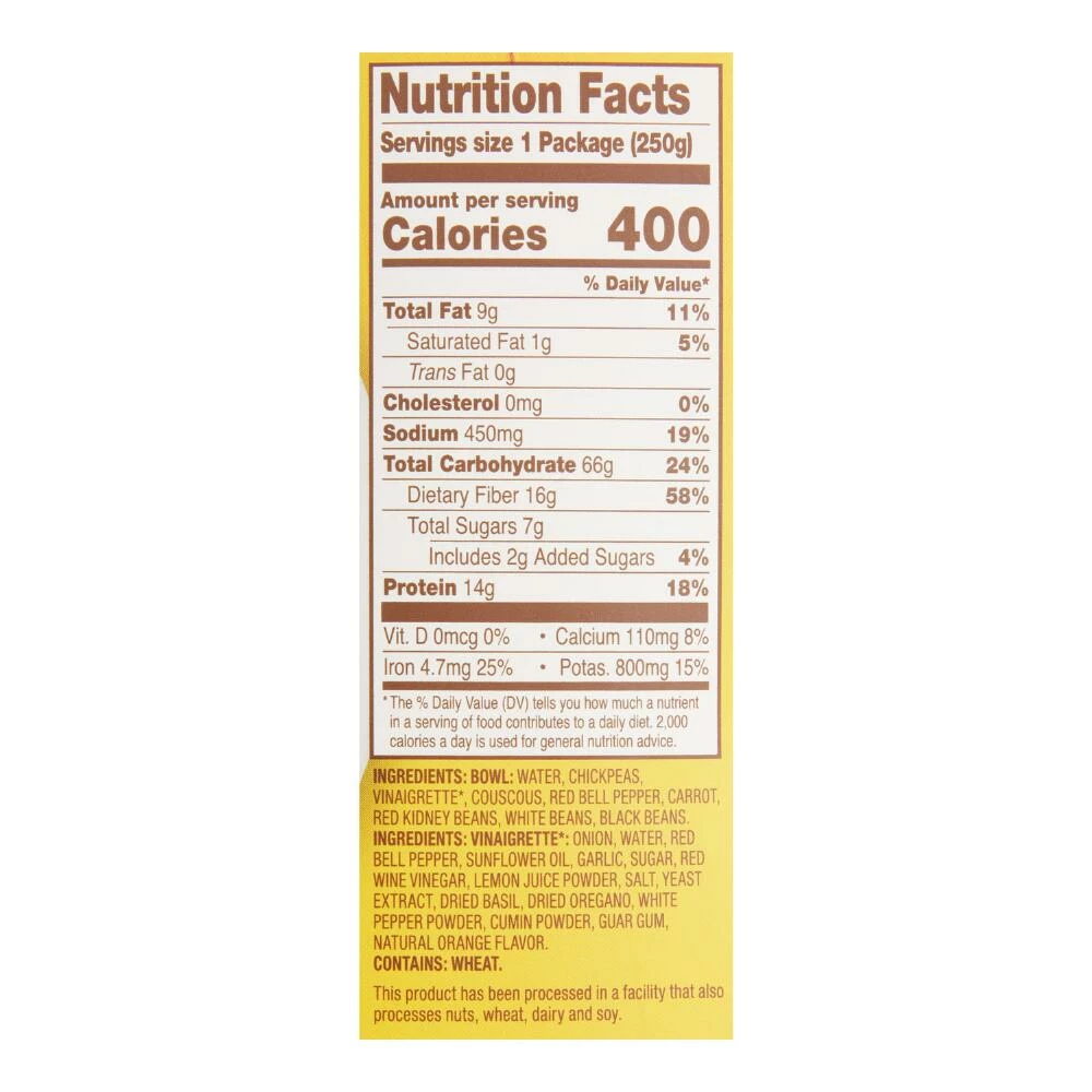 - Made with chickpeas, kidney beans, white beans, black beans, couscous, red bell pepper, carrots and seasonings