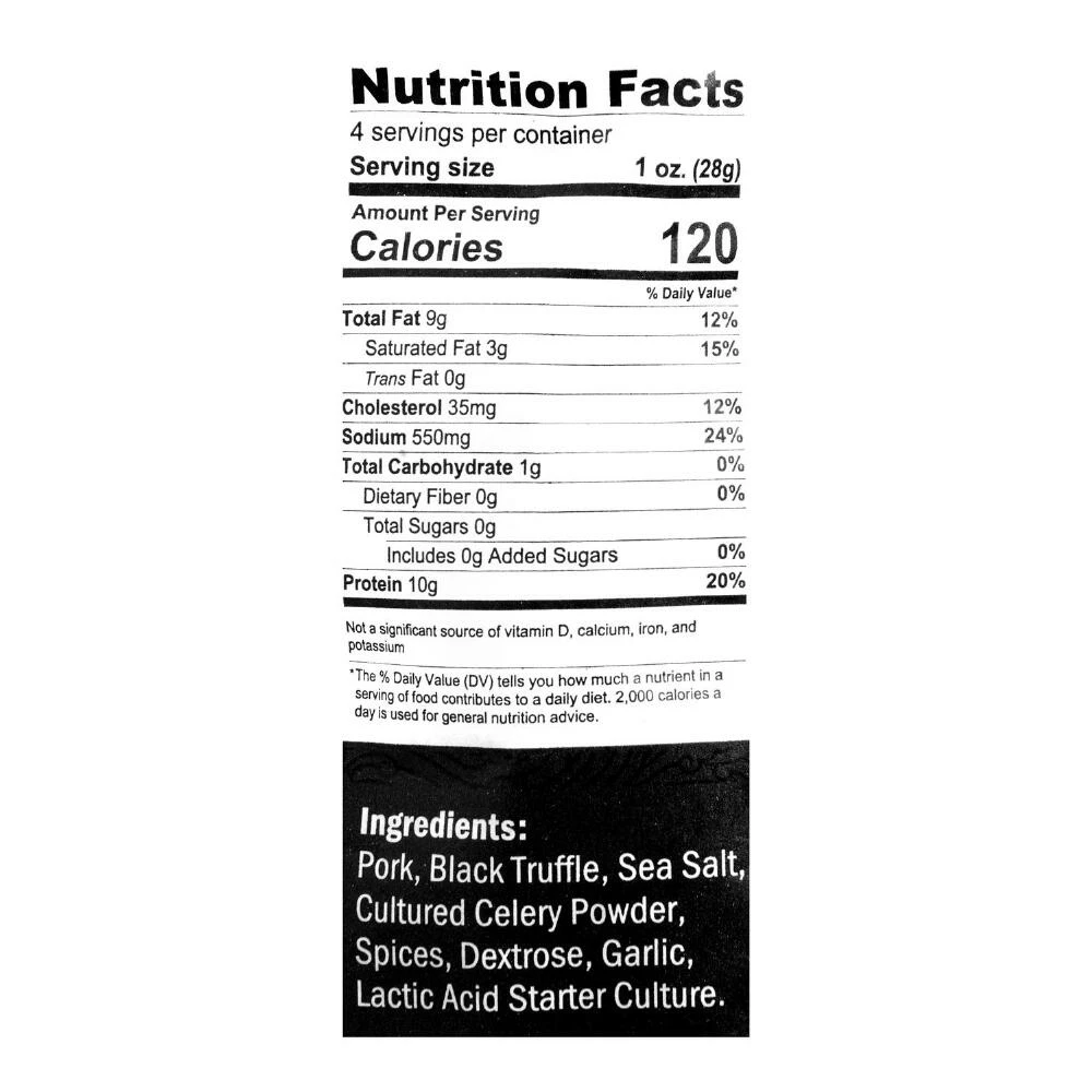 - Made with uncured pork, black truffle salt, minced black truffles and black Tellicherry peppercorns