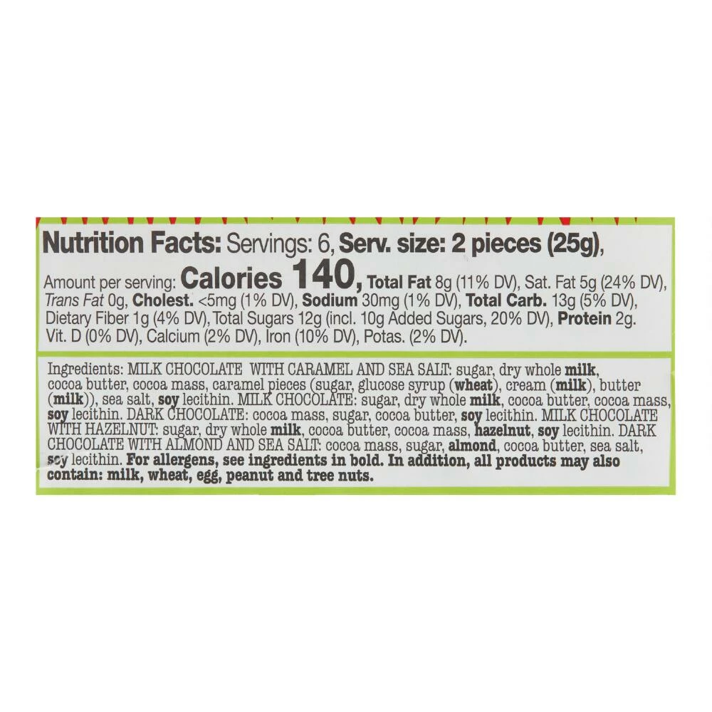- 12-Piece includes Milk Chocolate, Dark Chocolate, Milk Chocolate Caramel Sea Salt, Dark Chocolate Pecan Coconut and Dark Chocolate Almond Sea Salt eggs