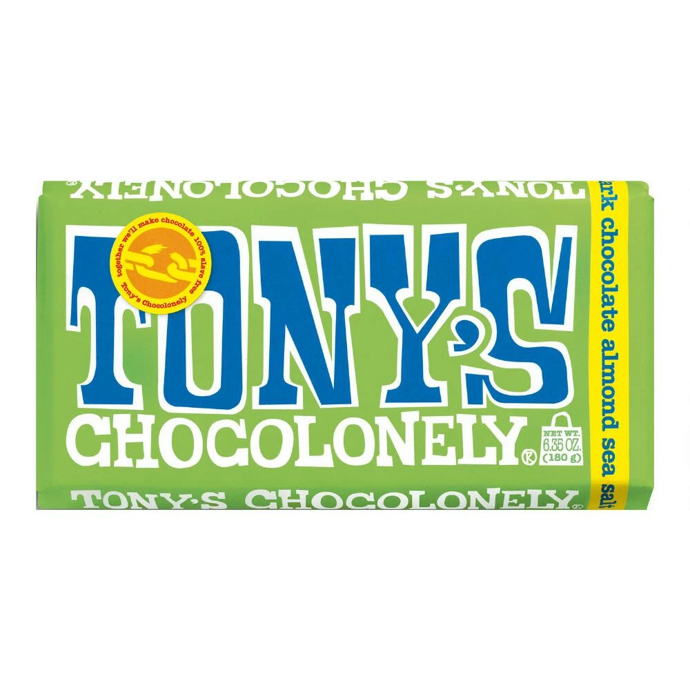 With its vivid retro packaging and authentic, rich dark chocolate taste combined with crunchy almonds pieces and sea salt, this large Tony’s bar is sure to delight chocolate lovers. Crafted with cocoa sourced from 100% slave-free cocoa farms in Ghana and the Ivory Coast, this delicious Fair Trade bar is as good for the soul as it is for the sweet tooth.