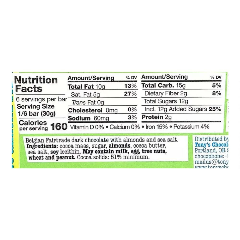 - Made of 51% Belgian dark chocolate, almonds and sea salt