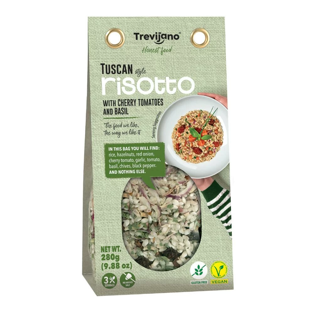 Bring gourmet Italian-style cuisine to your table with Trevijano’s Tuscan risotto, a gluten-free dish with a quick cooking time. Its vegan blend of rice, crunchy hazelnuts, cherry tomatoes and basil is a delight for the taste buds. Just follow the easy instructions for a risotto dish that will liven up your weeknight meals with the fresh flavors of Tuscany.