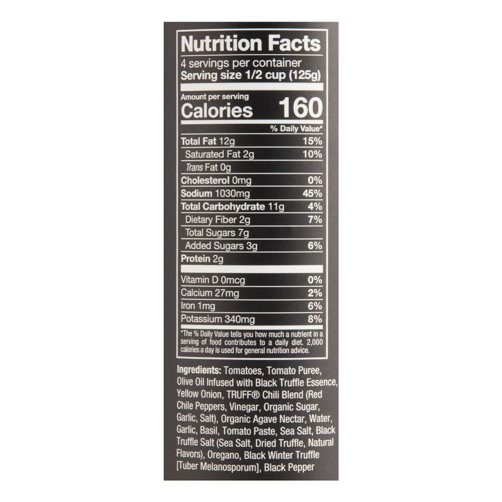 - Made with black winter truffles, black truffle salt, red chili peppers, garlic, basil, oregano and tomatoes
